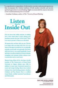 Listen from the Inside Out is written as an everyday guide to give you a taste of the variety and effectiveness of the powerful tools available to you within the field of Sound Therapy. You learn the science behind how and why it works and some of the mysticism of its ancient practices.